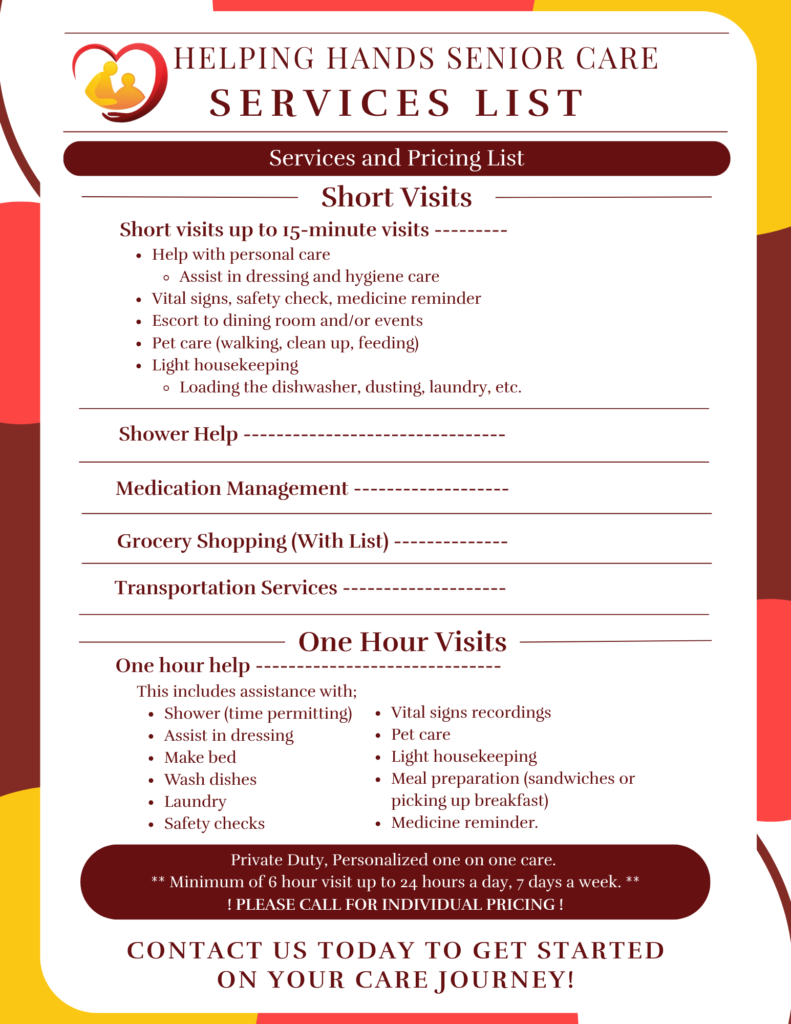 15-minute visits. We have four Senior Living Places that we offer this service. It can be breakfast delivery, starting the dishwasher or laundry, making and turning down of the bed, medicine reminder or help with bathroom breaks.